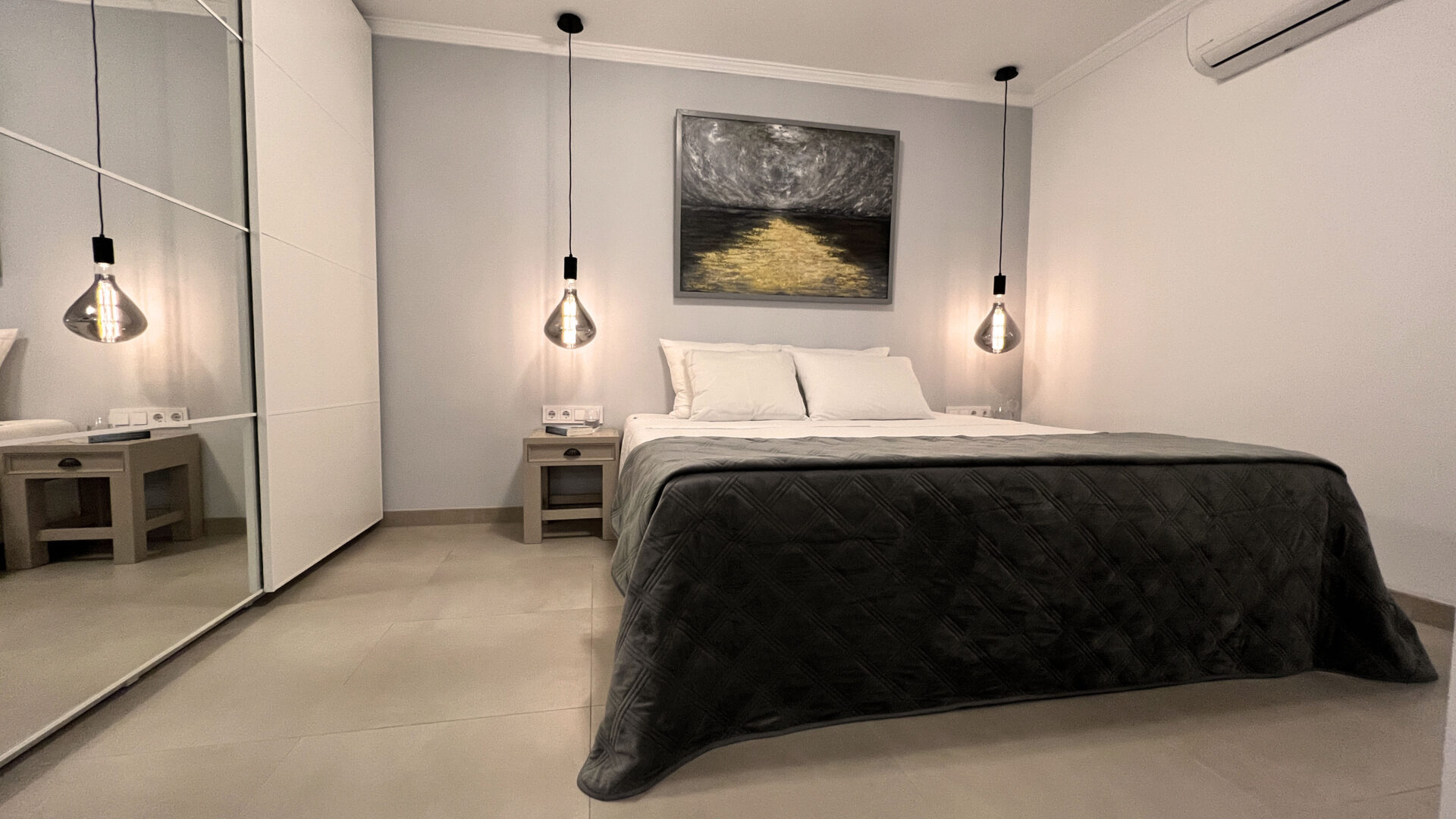 If you are into some extra luxury, then you’ll love the Master Guest Room. Apart from the large smart-TV, air conditioning and heating, a large wardrobe closet with sliding mirror doors and a super comfortable king size double bed, the room has a very spacious ‘en suite’ luxurious bathroom with a bathtub (big enough for two), a separate relaxing rain shower and a toilet with bidet. Service includes fresh and soft luxury bath towels and complementary shower gel and shampoo.