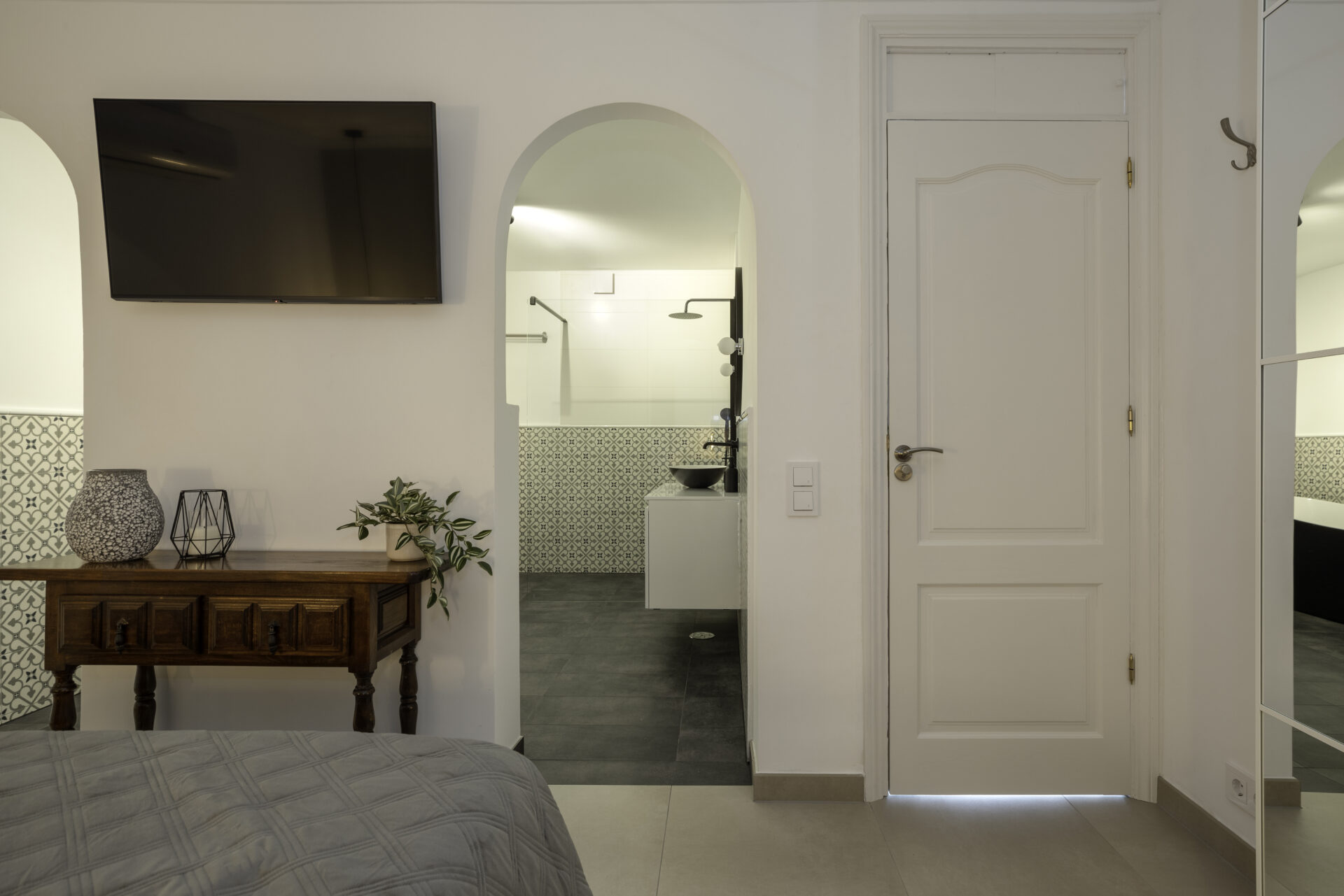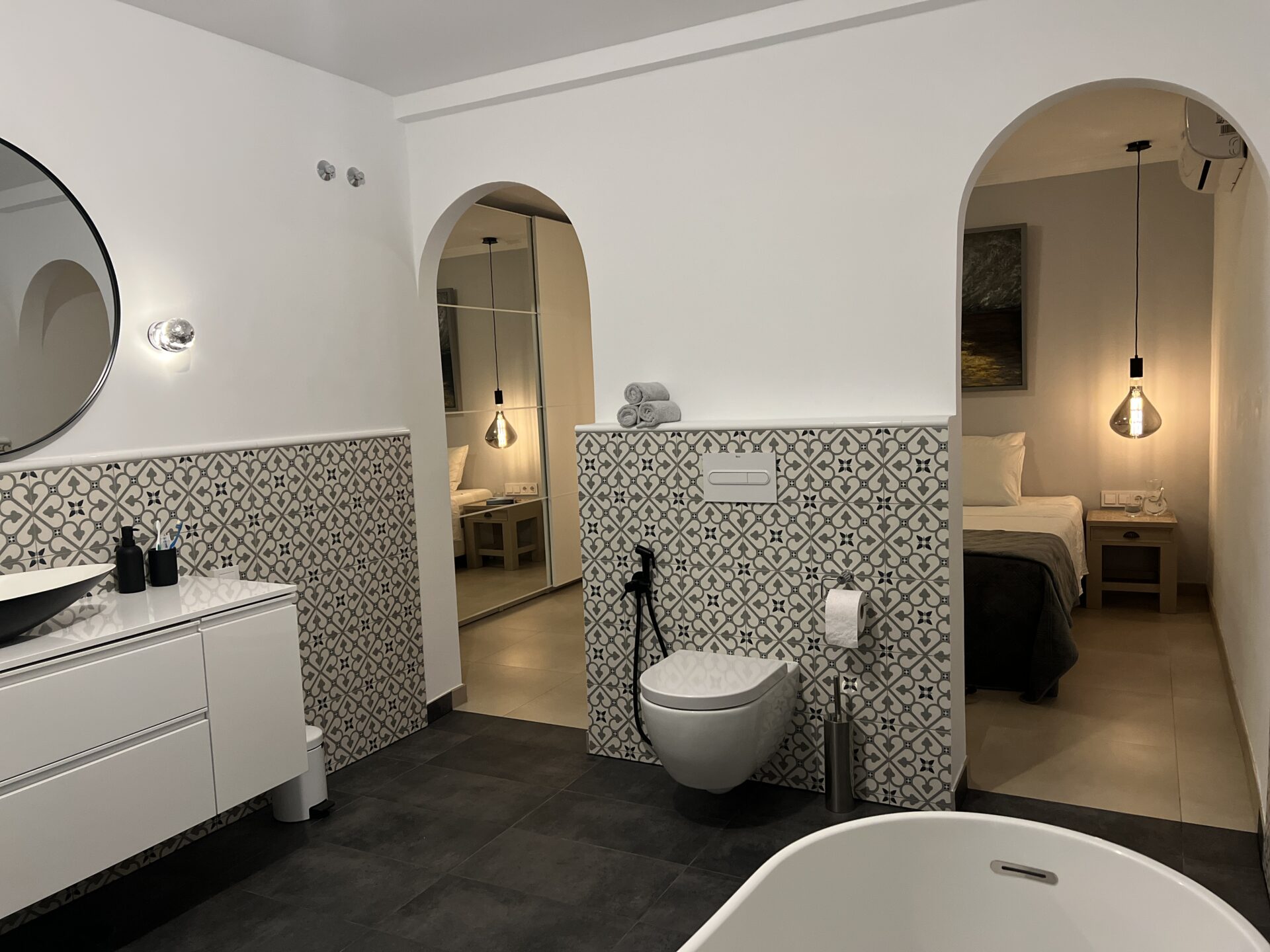 The Master Guest Room (a.k.a. the ‘gray’ room) is our most luxurious room. Not only does it have a very comfortable kingsize double bed, there’s a big smart TV on the wall in case you want to stay in and watch a movie. The royal sized ‘en suite’ bathroom has a toilet, a bath tub big enough for two, and a separate rain shower. Besides all this you have access of course to all the facilities of Casa Roffa (kitchen, sun deck, pool etc.).